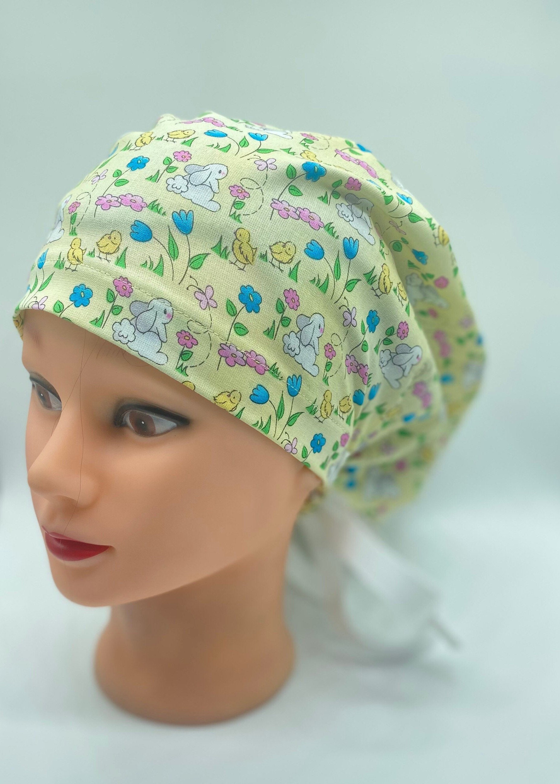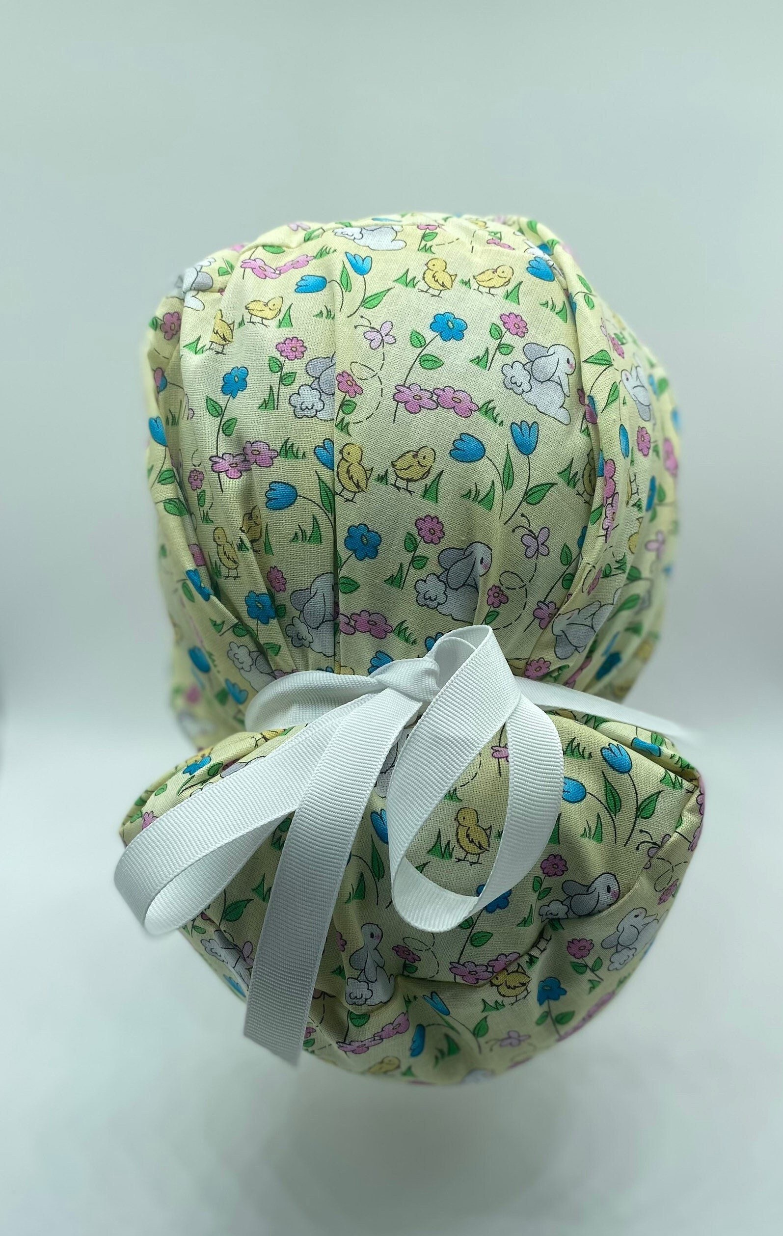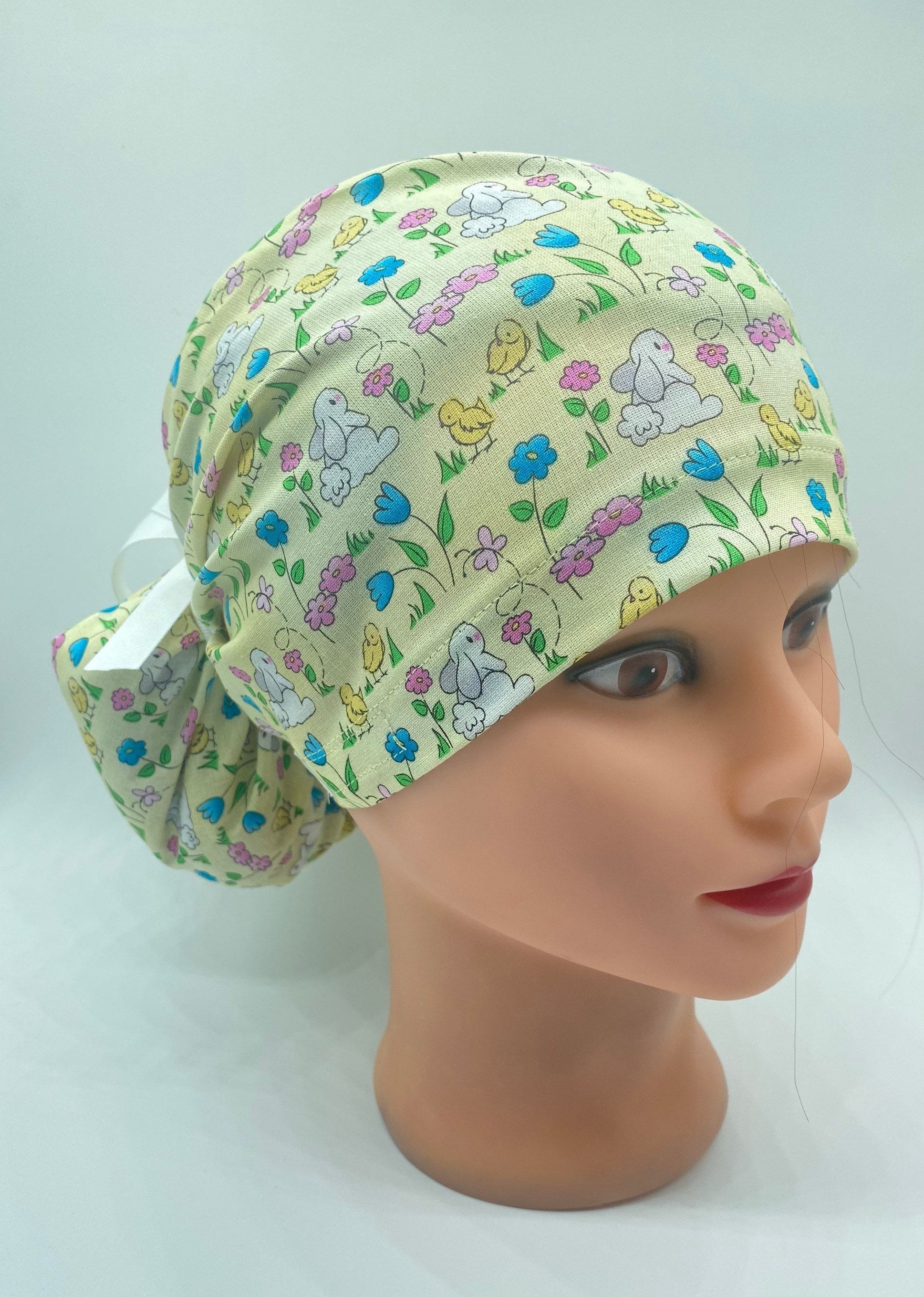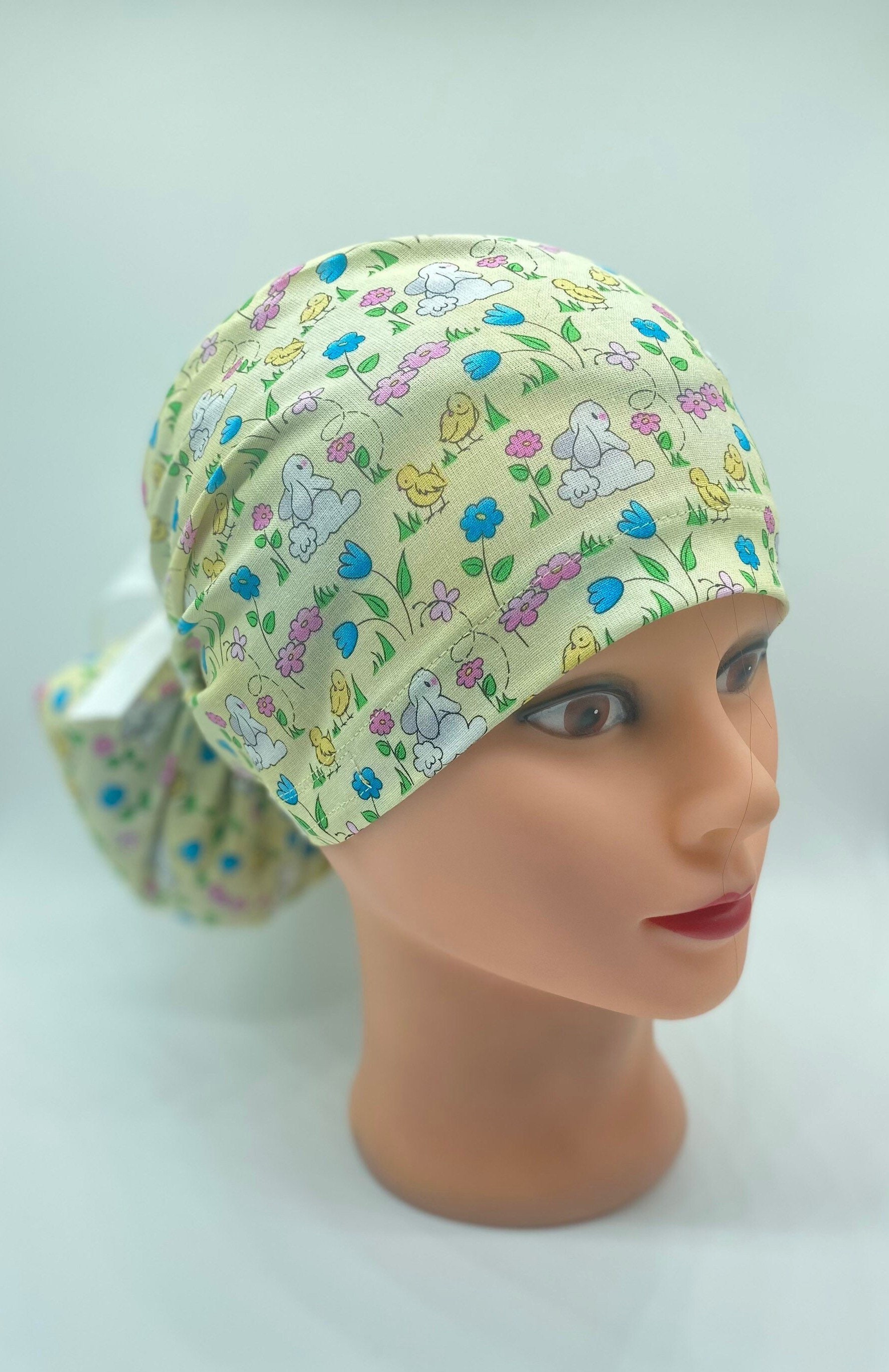 💜This is a full coverage Easter bunny bonnet / ponytail scrub caps with ribbon ties, available with or without buttons. Comes with an elastic back for a comfortable fit every.