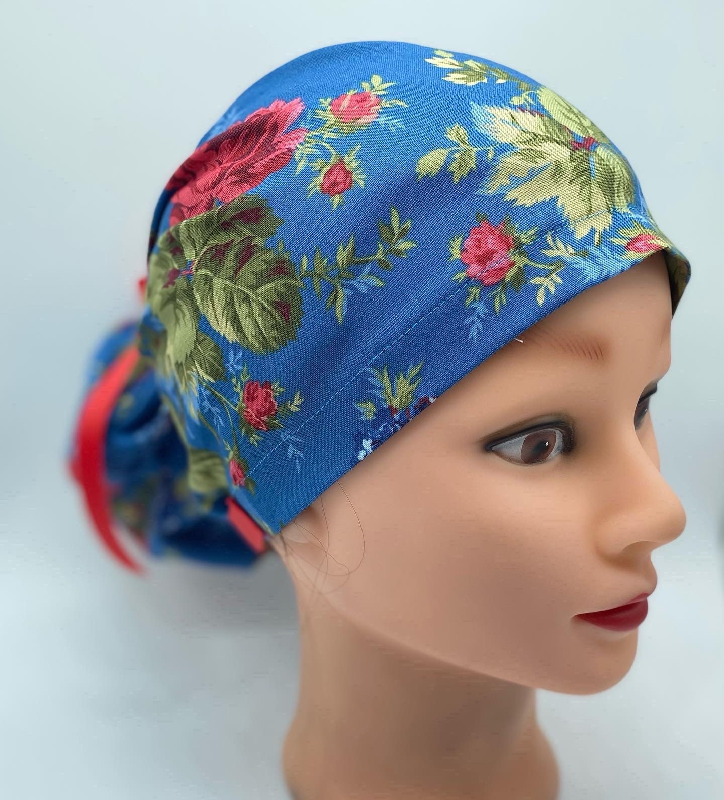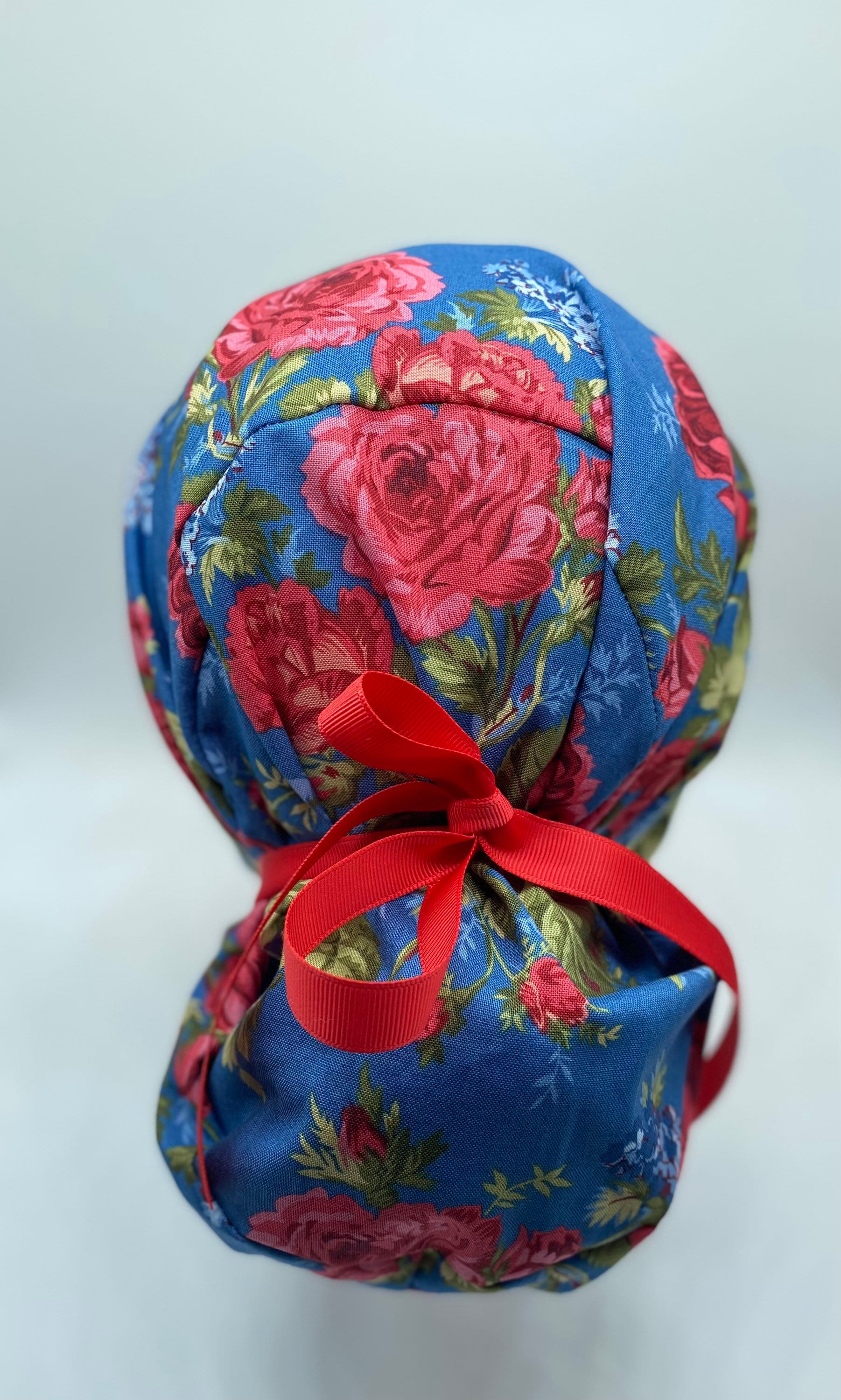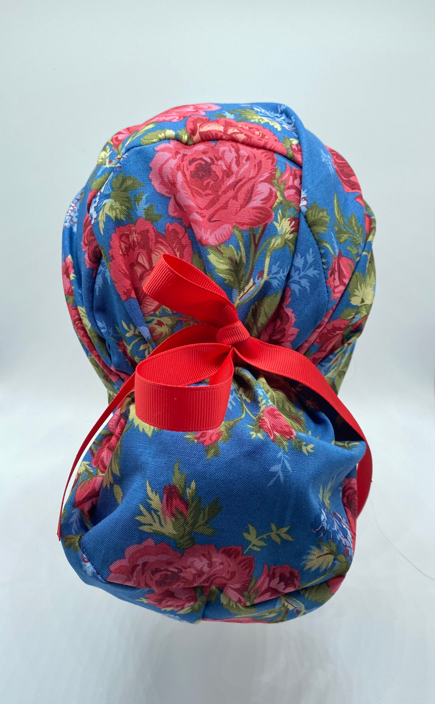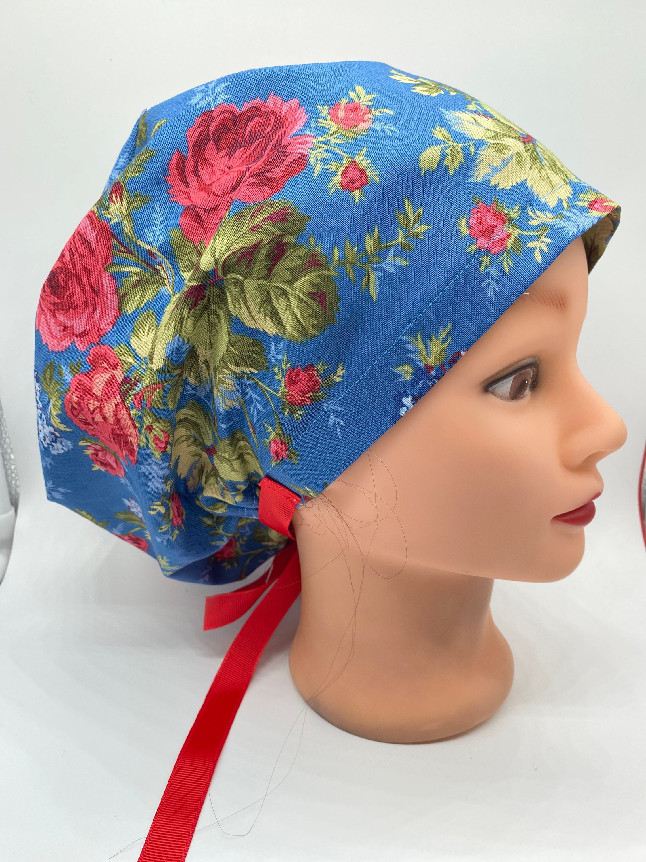 🌹 Blue scrub cap with red roses, a light weight summer feel scrub cap. This full coverage bonnet / ponytail scrub cap with ribbon ties is available with or without buttons. Comes with an elastic back for a comfortable fit every. One scrub cap, two ways to wear
