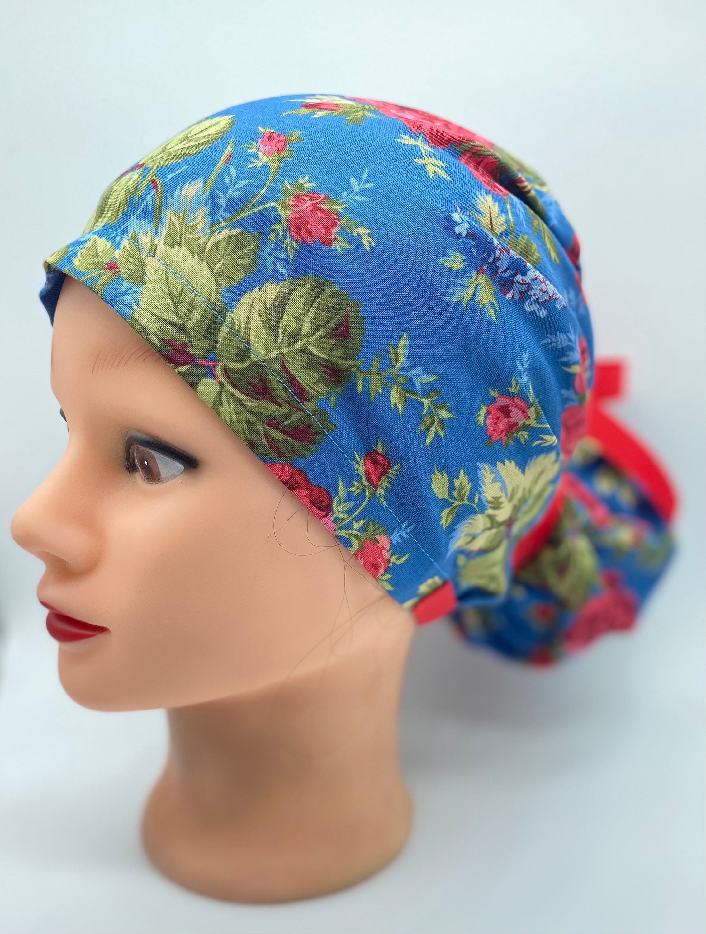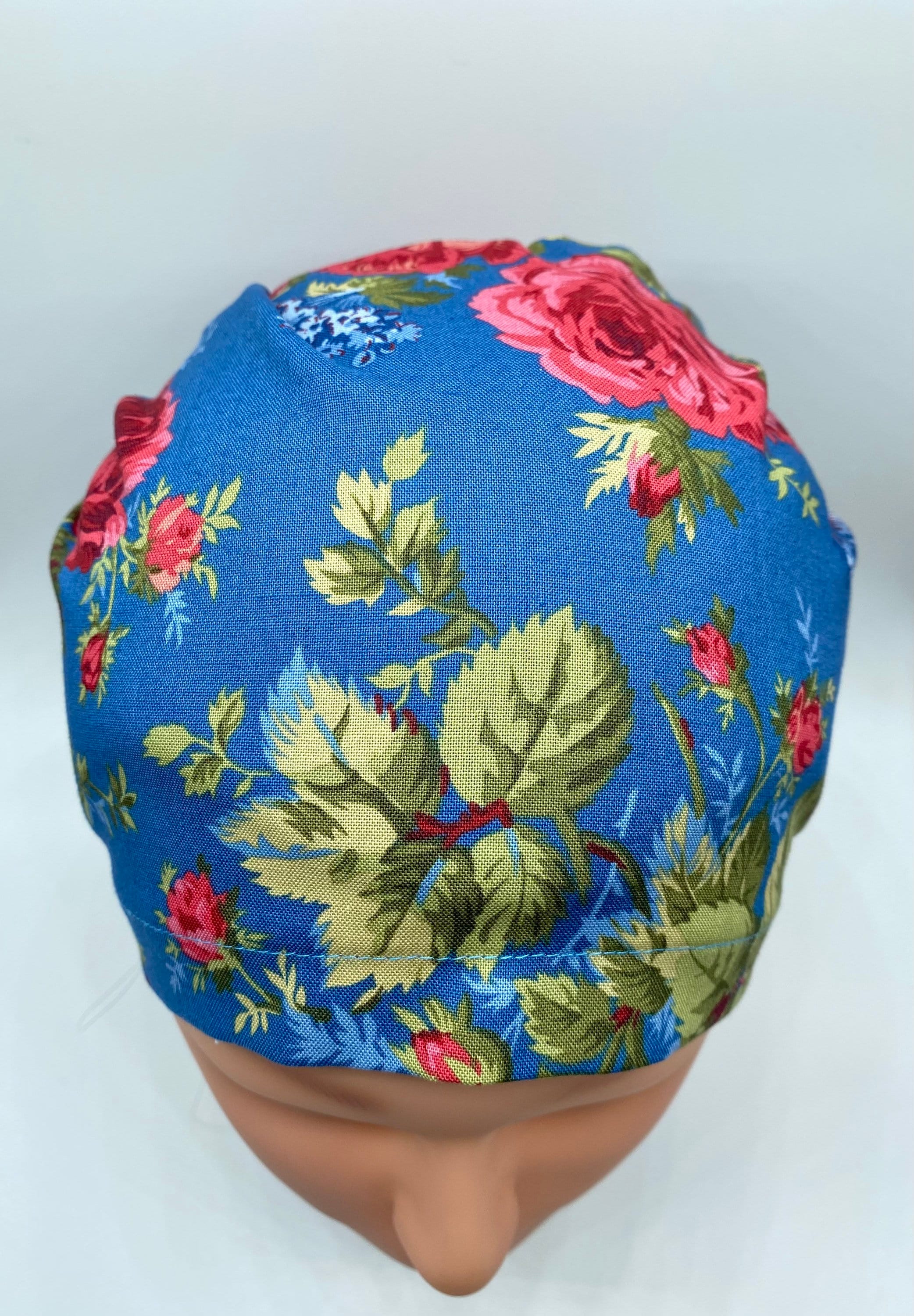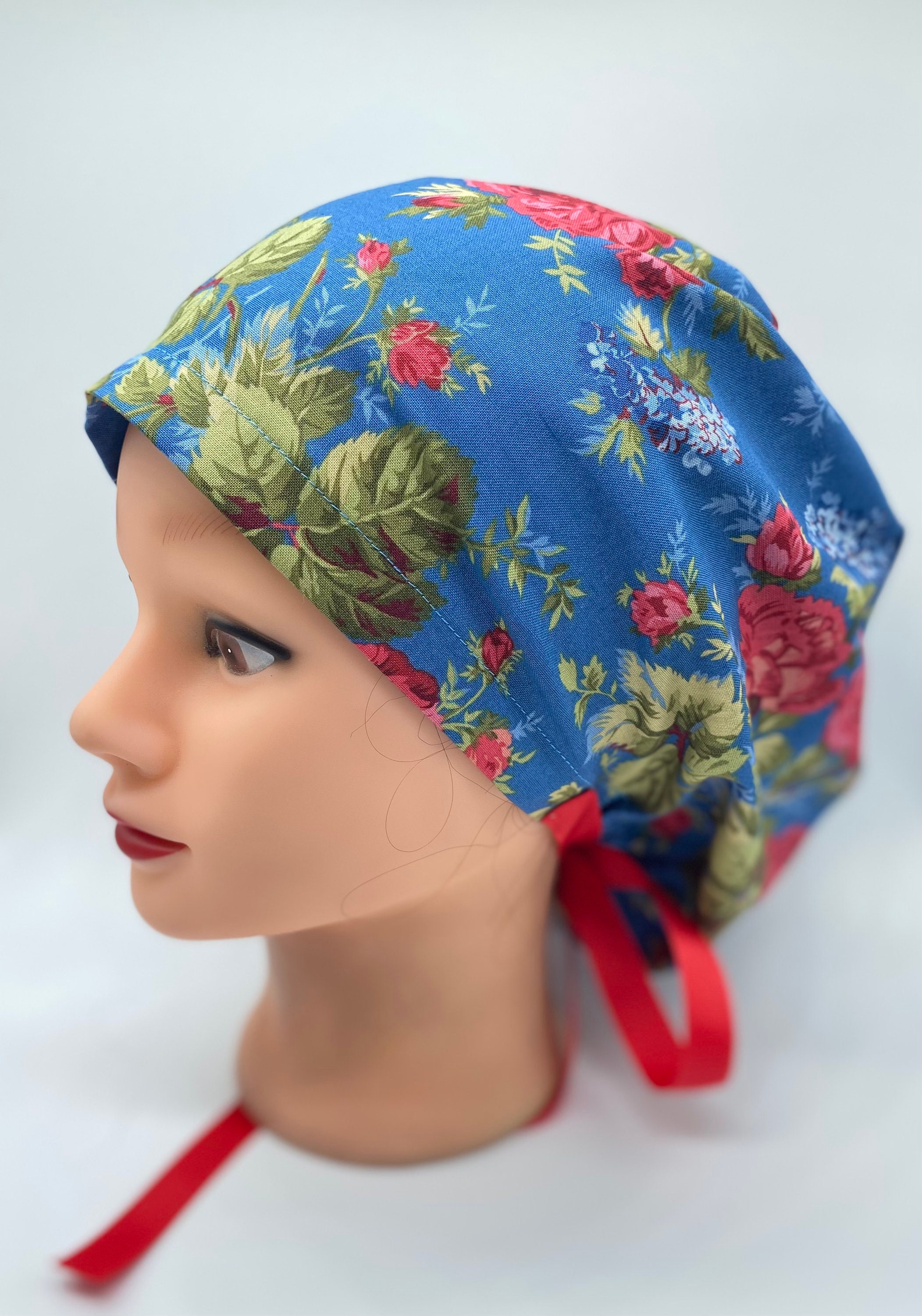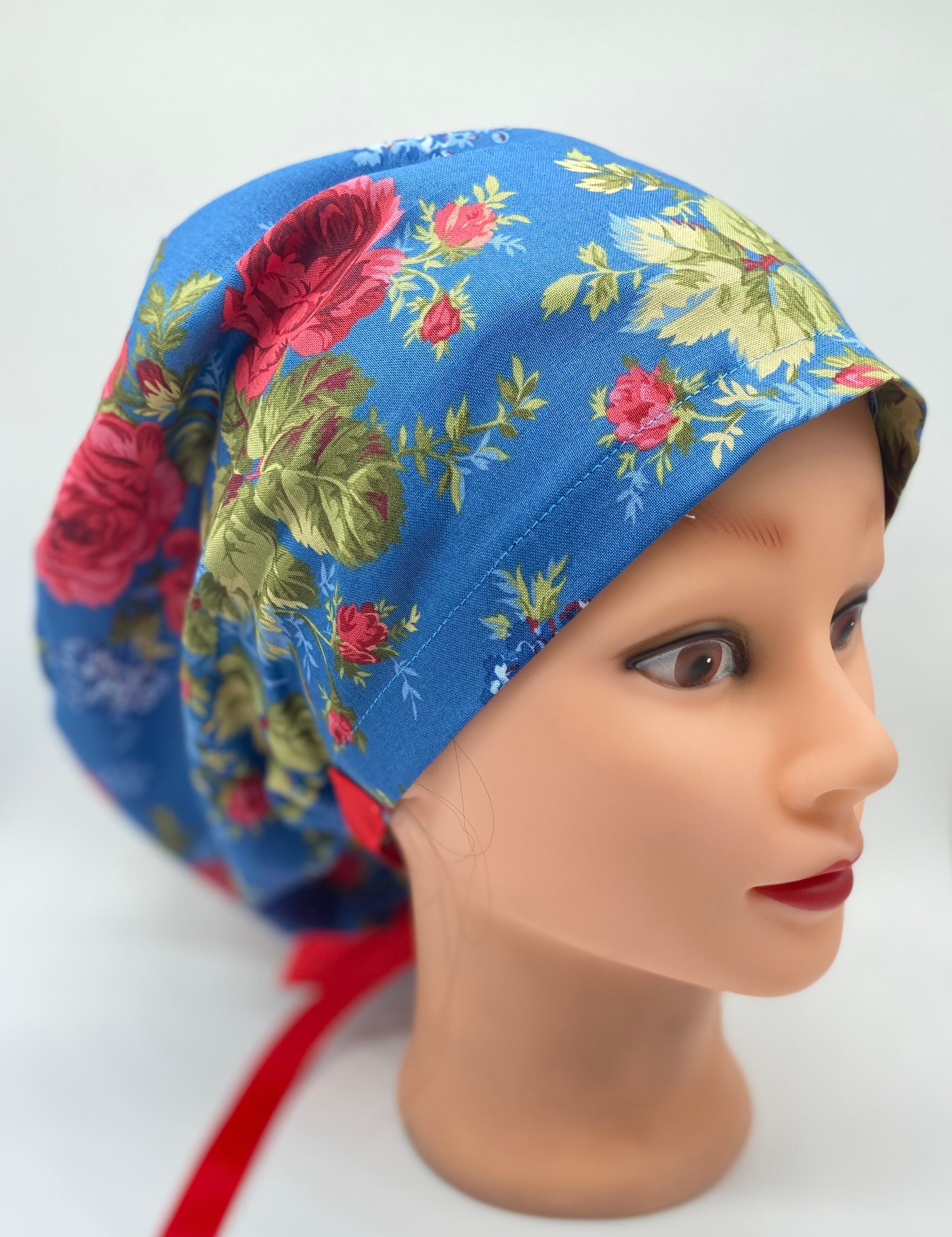 🌹 Blue scrub cap with red roses, a light weight summer feel scrub cap. This full coverage bonnet / ponytail scrub cap with ribbon ties is available with or without buttons. Comes with an elastic back for a comfortable fit every. One scrub cap, two ways to wear