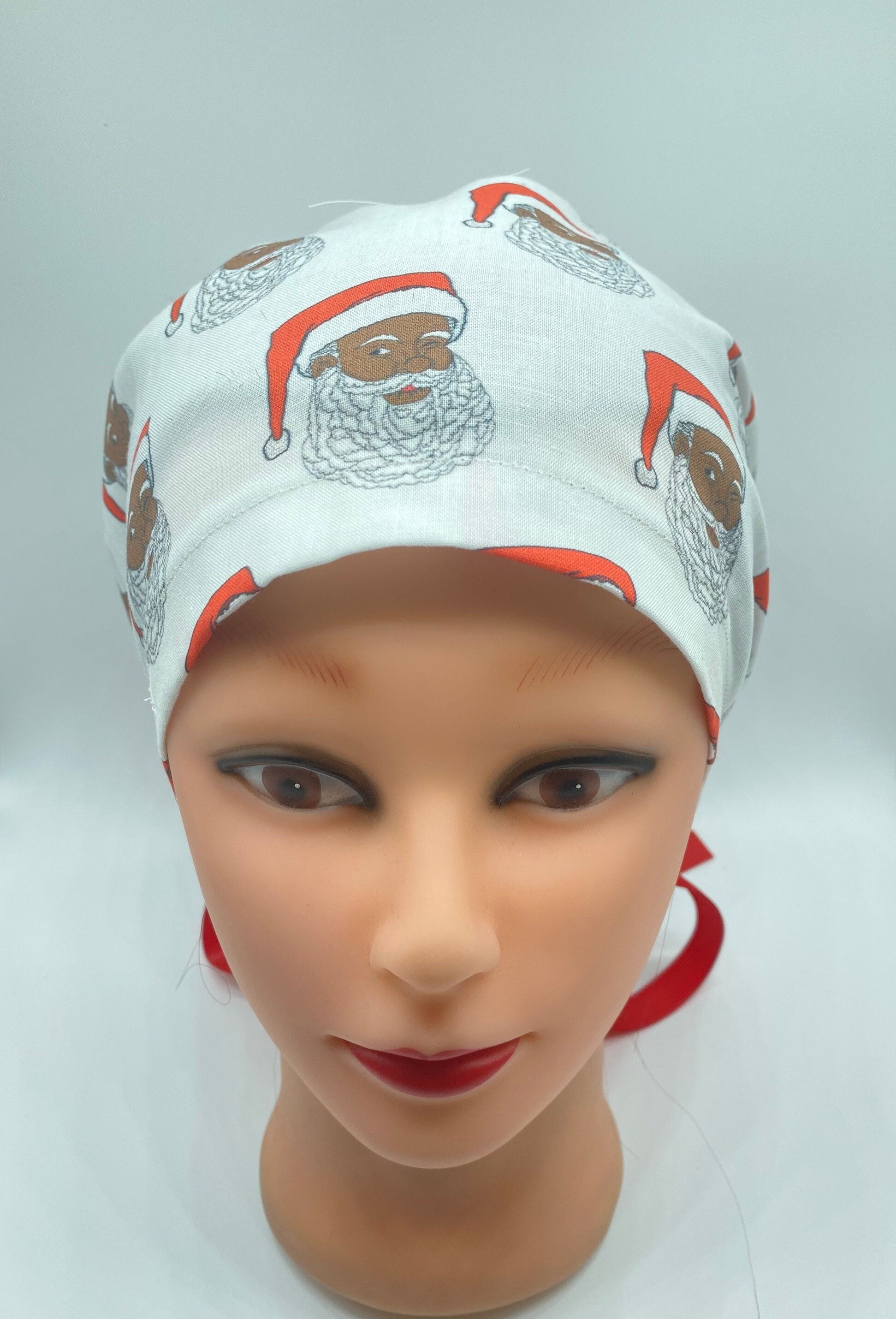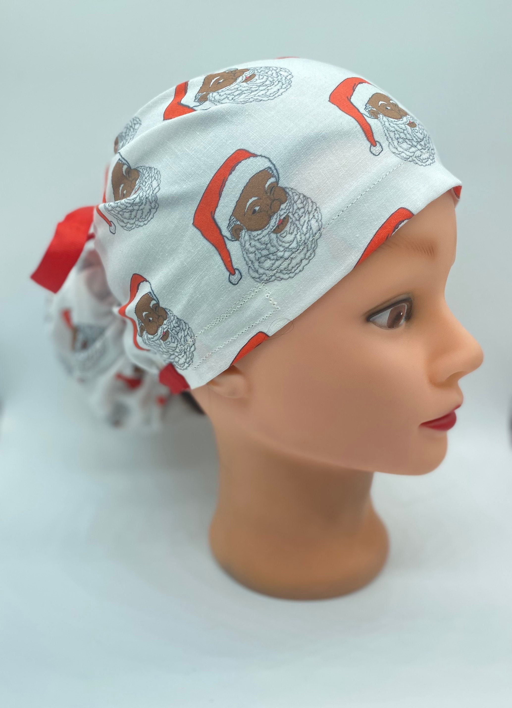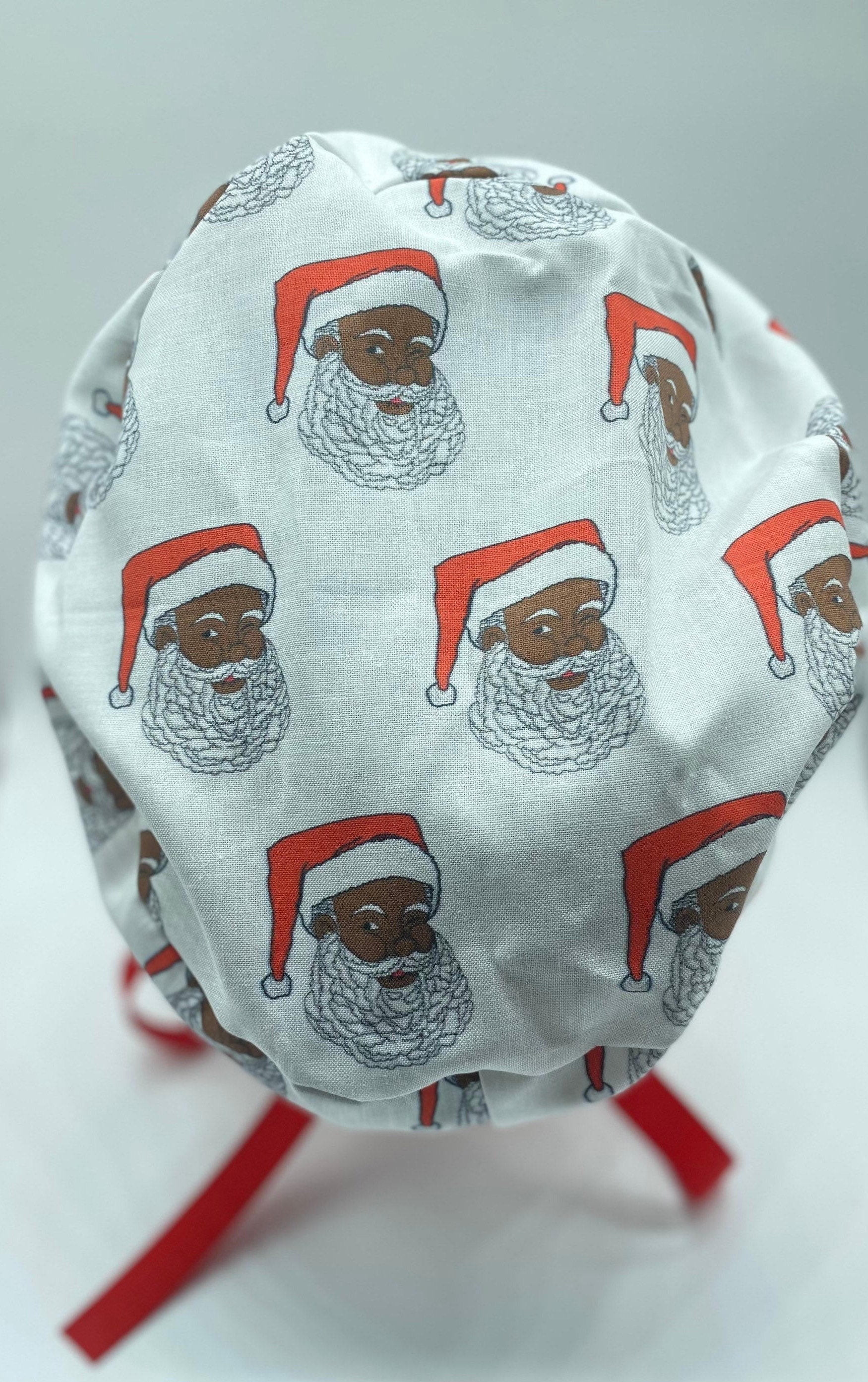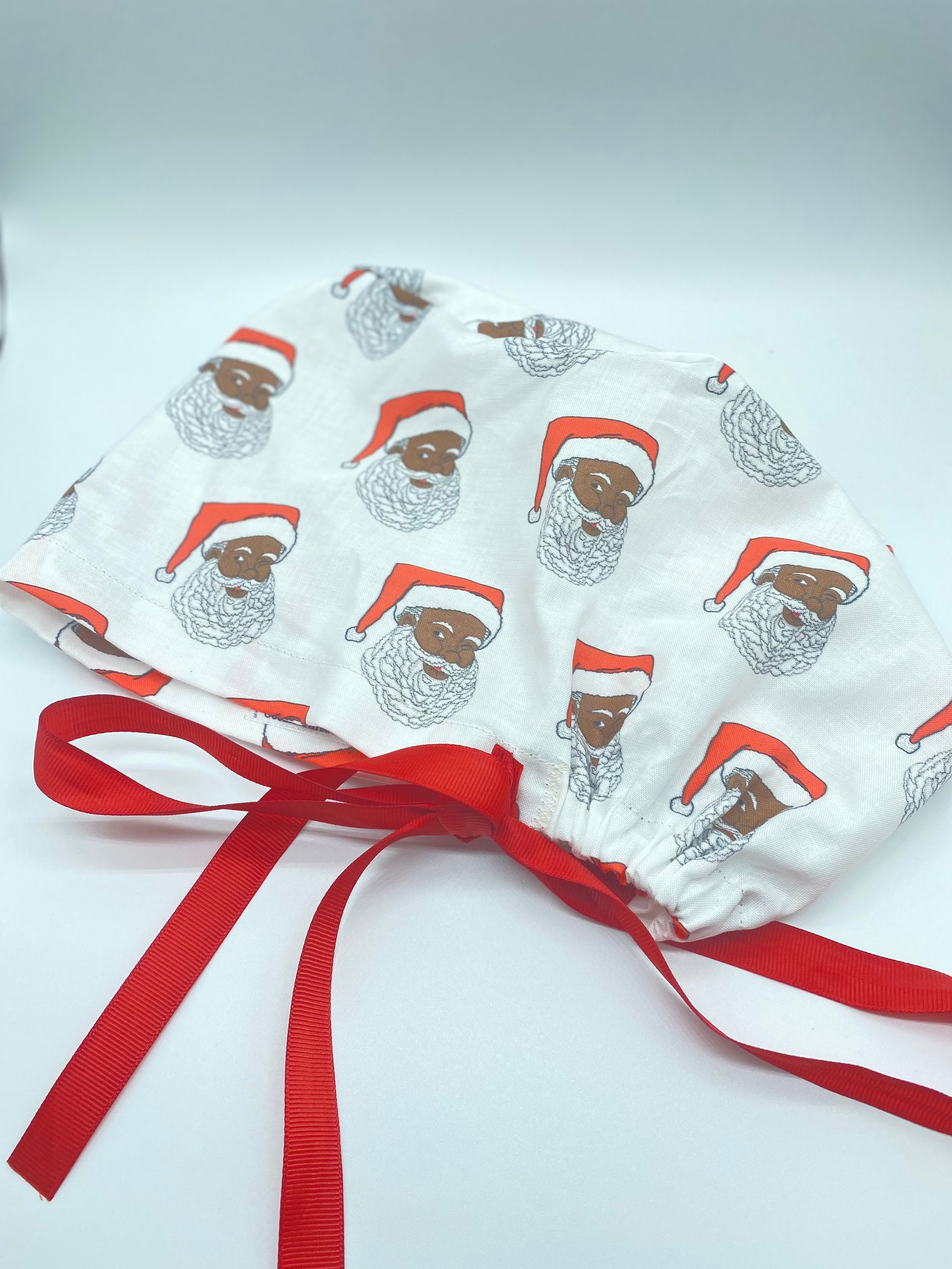 🎅🏿African American Santa Claus Bonnet scrub cap with red ribbon ties.