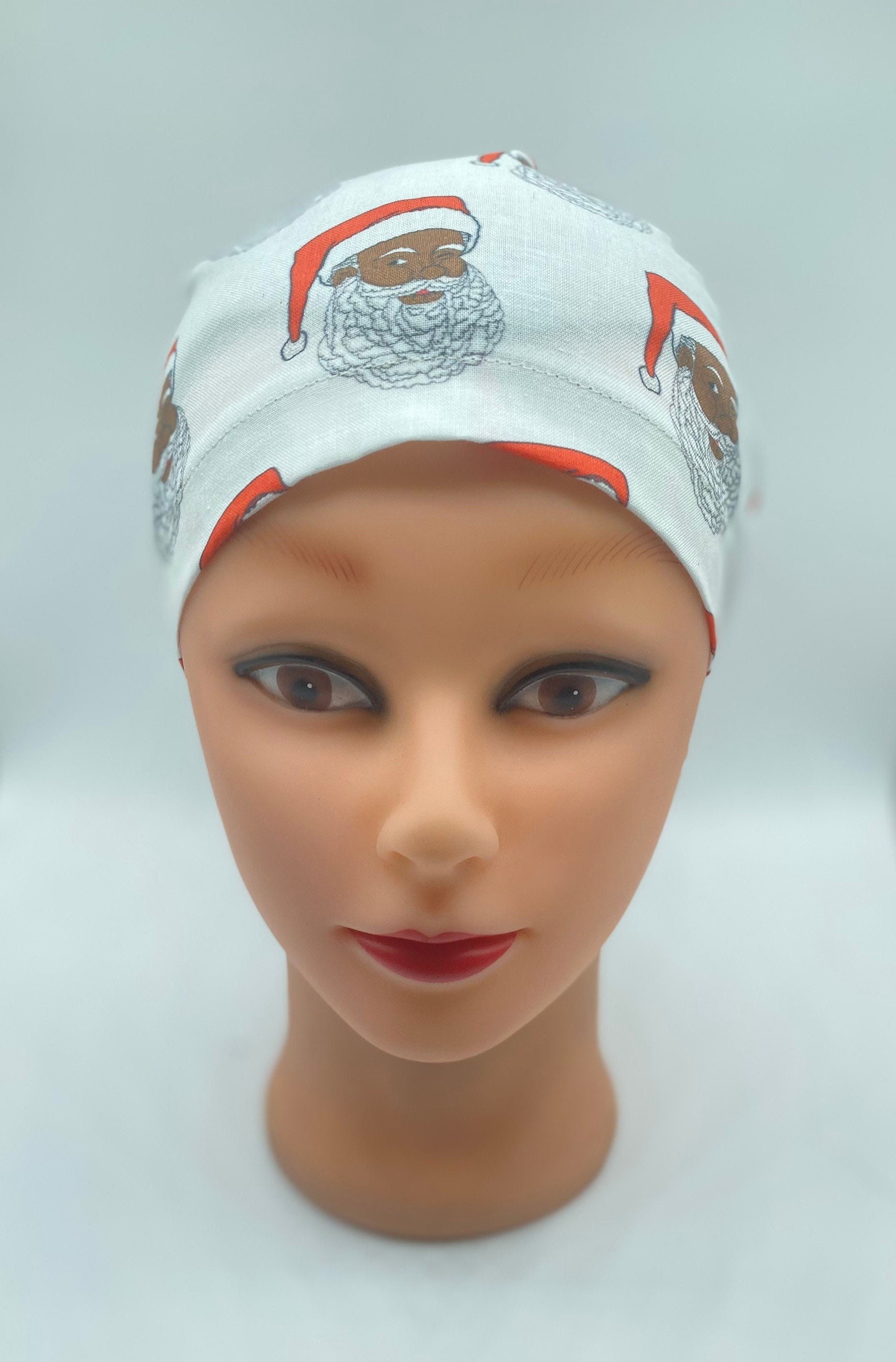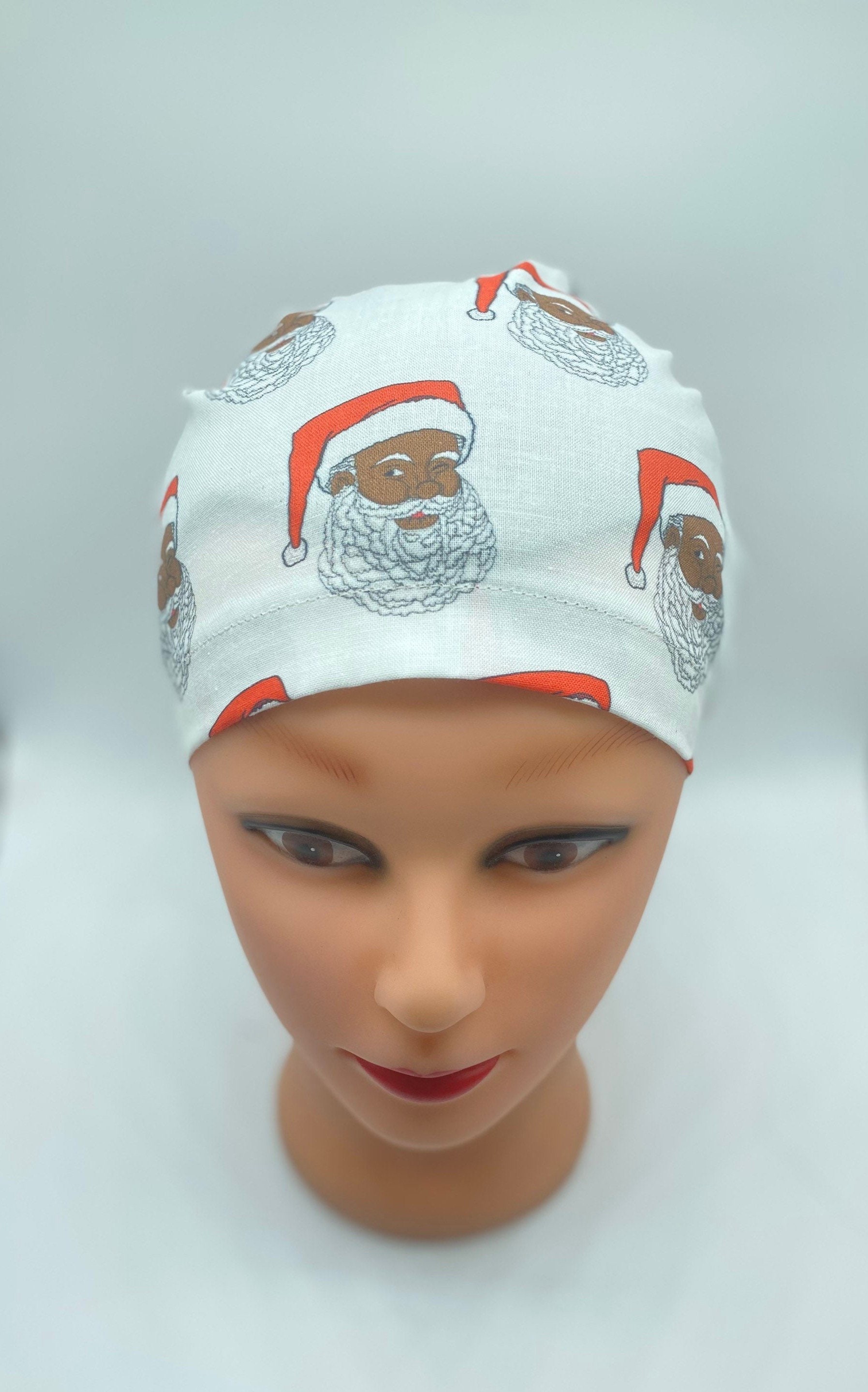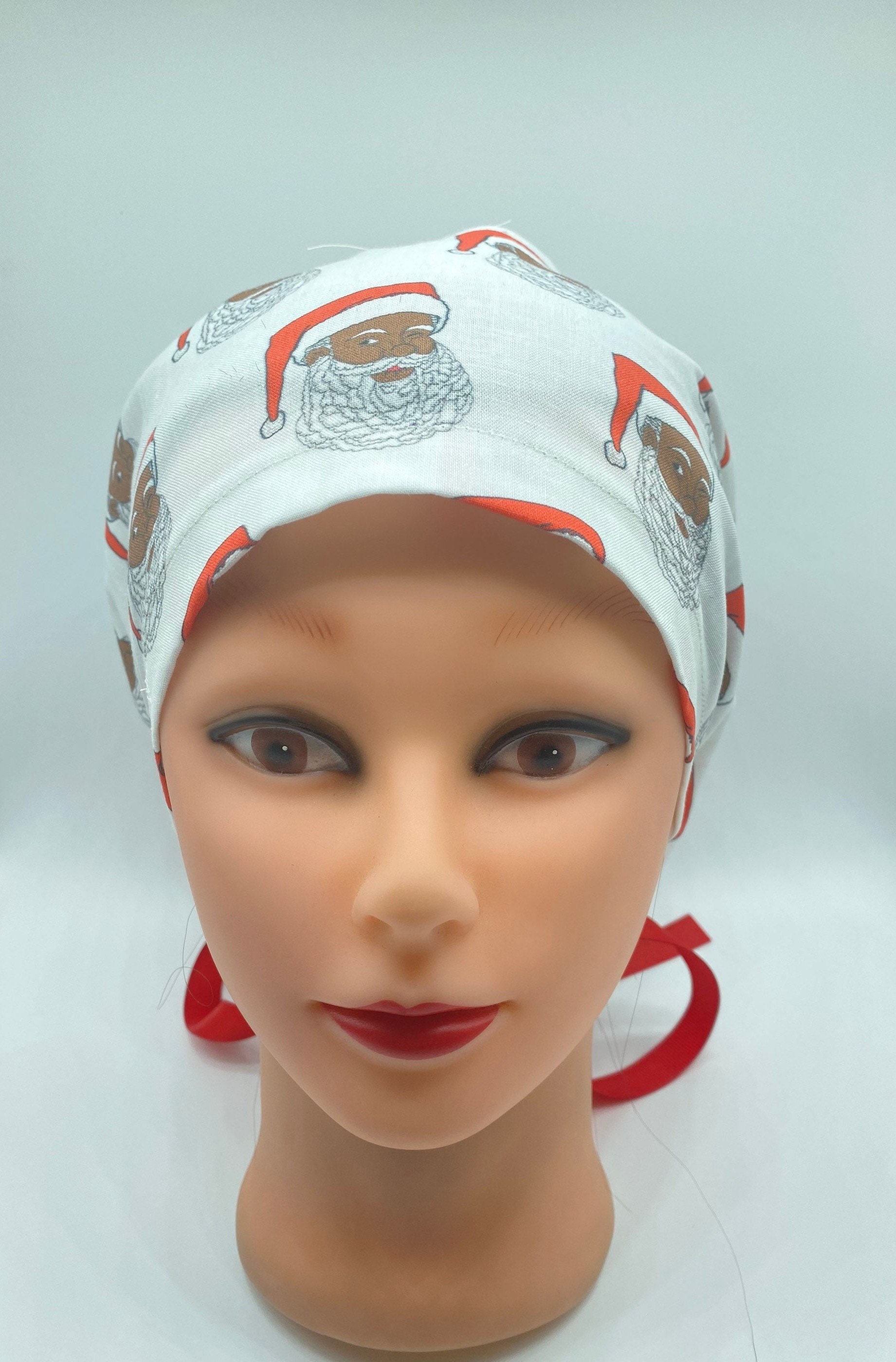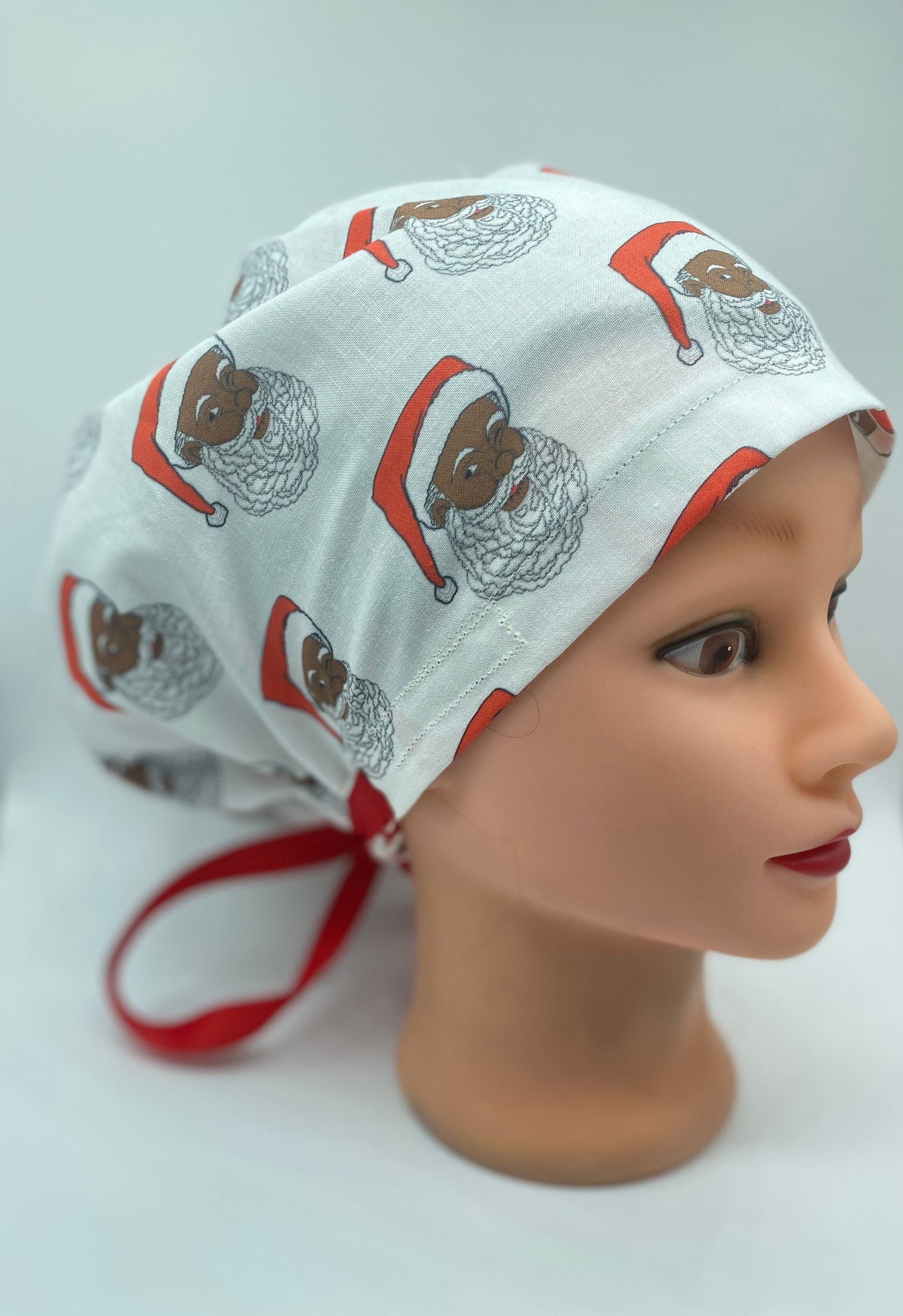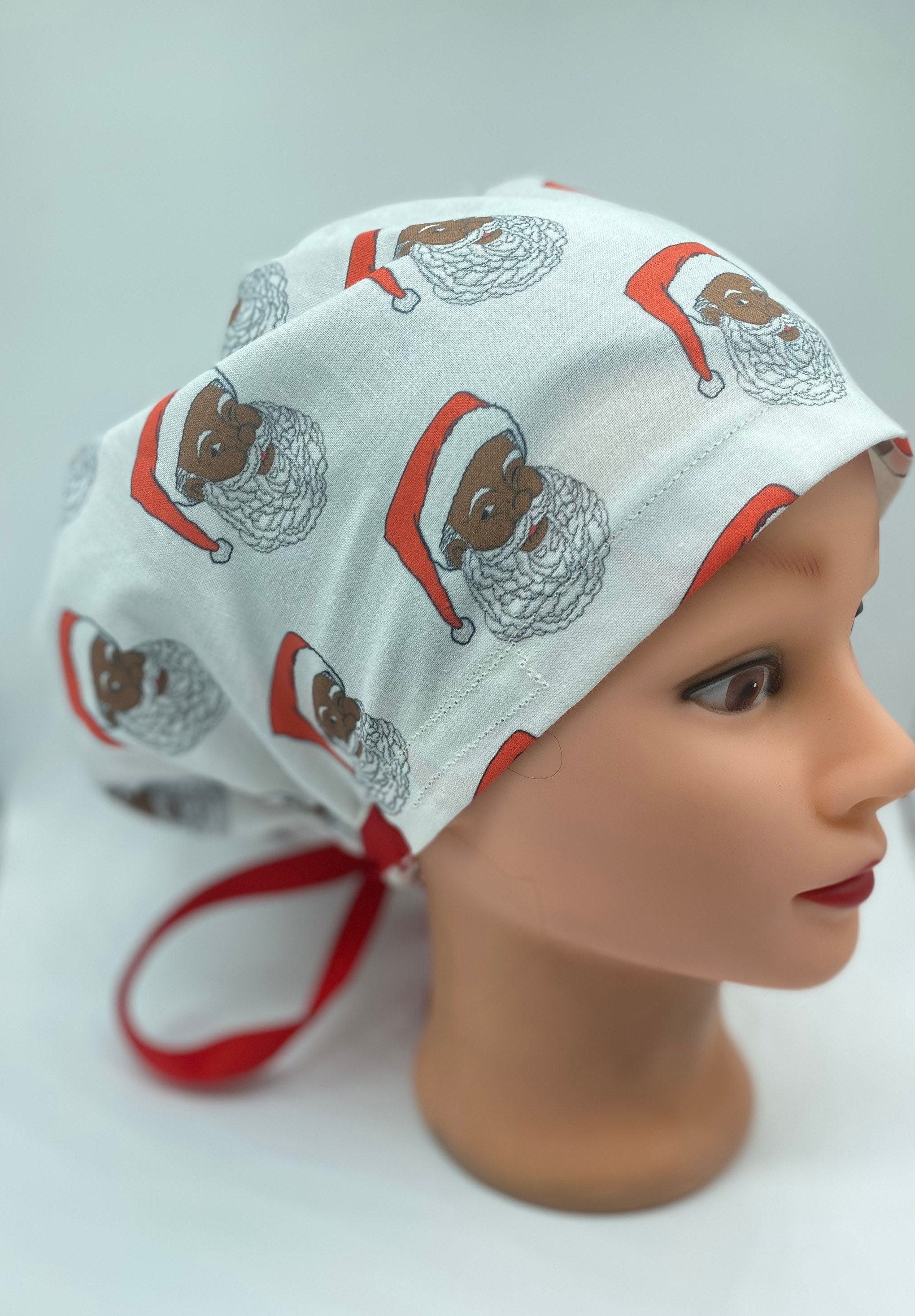 🎅🏿African American Santa Claus Bonnet scrub cap with red ribbon ties.